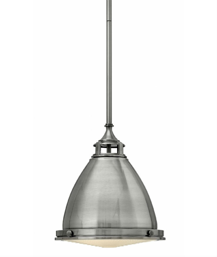 Amelia’s classic pendant design reinvents vintage details with a cast glass fitter, cast metal trim ring and prominent hinges and clasps. The etched opal glass dome has an etched prismatic bottom lens for classic retro inspiration, while the full metal body versions have a more vintage appearance to them.